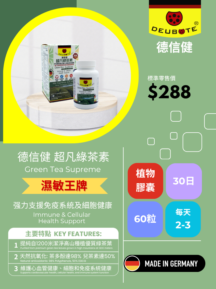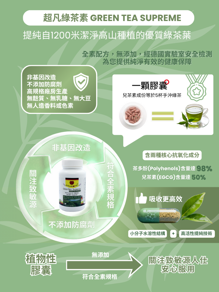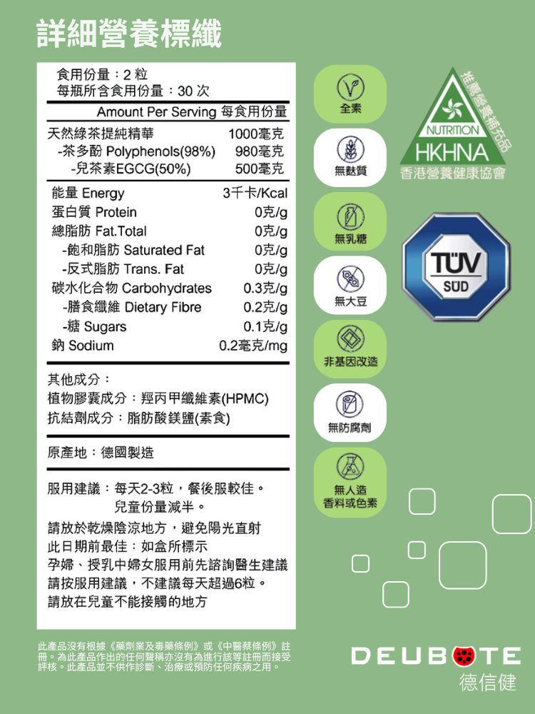 德信健超凡 綠茶素,德國製造,提純自1200米潔淨高山種植的優質綠茶葉,非基因改造,不添加防腐劑,高規格廠房生產,無麩質、無乳糖、無大豆、無人造香料或色素,植物性膠囊,符合全素規格,也讓關注致敏源人仕安心服用。