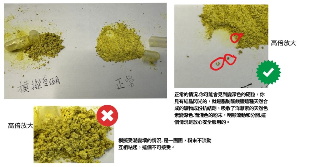 – 異常受潮變質 → 膠囊內結成硬塊/潮濕團塊,粉末不流動,伴隨異味(不是小硬粒,小硬粒有機會是脂肪酸鎂鹽,而一受潮就是較大結塊甚至整個膠囊內結實)