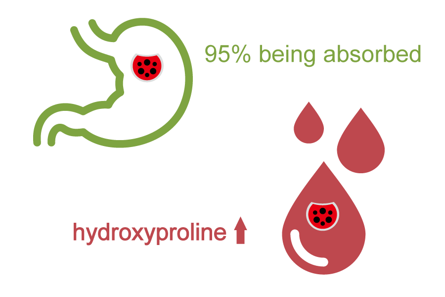 Collagen molecules from food are too large for intestine absorption directly. Deubote Hyper Bone Supreme Drink uses patented technology, Micro-biological hydrolysis collagen process, to extract collagen molecules which are 95 times finer than normal food collagen molecules and clinically proven 95% of the molecules are absorbed within 12 hours by intestine after intake.