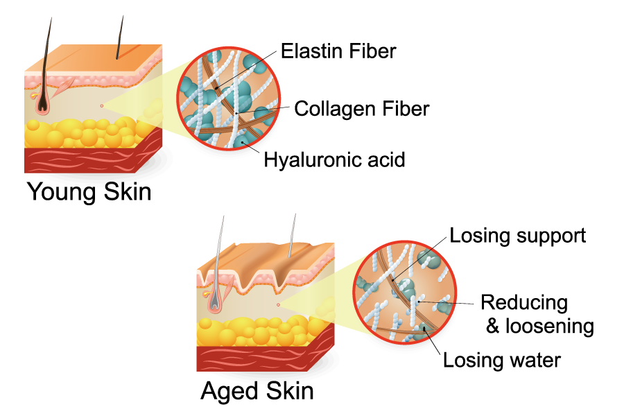 The dermal layer of the skin consists of hyaluronic acid, collagen fibers, cells, blood and lymph and nerve fibers, which accounted for 80% of the entire dermal layer. It is to support the skin structure and provide the skin with tension and elasticity. When our age increases, metabolism slows down. The loss of collagen will increase and leads to loosen of collagen fibers. Finally it results in the formation of wrinkles, relaxation, large pores, dry skin and affects the function of hyaluronic acid to retain water.
